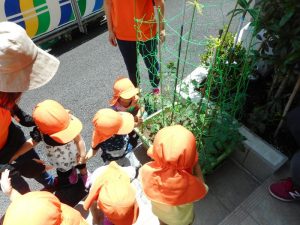 トマトの苗を植えてから、毎日水をあげながら、トマトの実がなるのを楽しみにしている子ども達。 散歩の帰...
