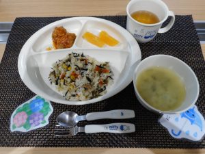 ・ご飯 ・ツナとじゃがいもの煮物 ・ささみのピカタ ・もずくのスープ ・パイン缶 ※0歳児にはパイン...