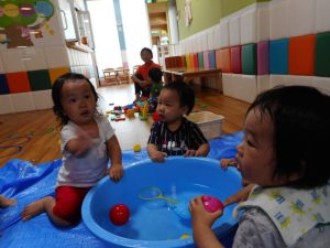 今週月曜日から、ものすごく暑っかったので、水遊びを始めました。 隣にコンビニが解体工事...