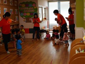 ピアノに合わせて、トンボになって、お部屋の中を飛びました。 みんなリズム遊び大好きです。 たのしい