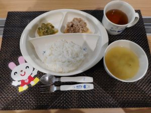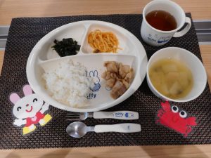 ・ご飯、みそ汁、鶏のマーマレード焼、スパゲッティソテー、小松菜のおかか和え