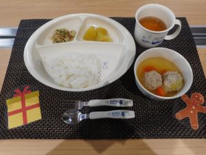 ・ごはん、肉団子スープ、混ぜ混ぜサラダ、さつま芋甘煮