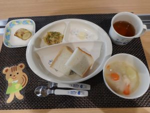 ・食パン、チキンクリームシチュー、混ぜ混ぜサラダ、チーズ、バナナ