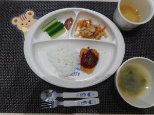 ・ごはん、みそ汁、魚のフライ、切り干し大根の煮物、ステックきゅうり