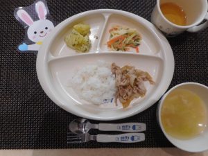 ・ごはん、みそ汁、焼き肉、スパゲッティサラダ、粉ふき芋