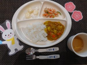 ・ごはん、カレーシチュー、切り干し大根のサラダ、チーズ