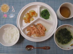今日の給食は、旬の鮭を使用した、鮭の和風ムニエルです!