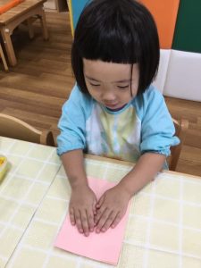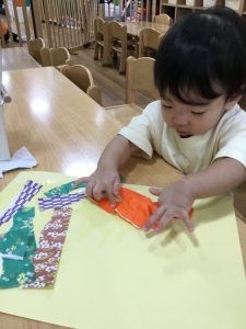 指先を使って折り紙を持ってビリビリ破いて紙の感触を楽しみながら制作をしました。