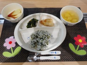 【乳児食】 ・わかめごはん ・竜田揚げ ・ごまあえ ・さつま芋のみそ汁 ・りんご 【離乳食】 ・わか...