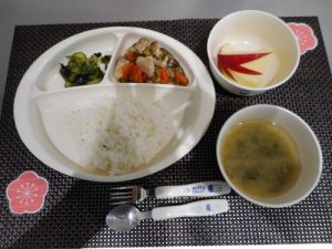 ・ご飯 ・鶏のすき煮 ・酢の物 ・玉ねぎとわかめのみそ汁 ・りんご