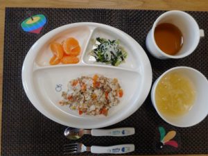 ご飯 フライドチキン ポテトサラダ 人参のコンソメスープ パイン缶