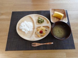 ご飯 味噌汁 きのこたっぷりオムレツ 小松菜ともやしのナムル りんご
