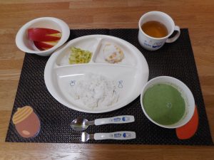 ご飯 ほうれん草のポタージュ 白身魚のムニエル コールスローサラダ りんご