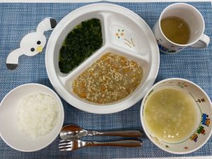 (写真は離乳食後期です。年齢によって形、固さ、盛り付け量を変えて、提供しています。)