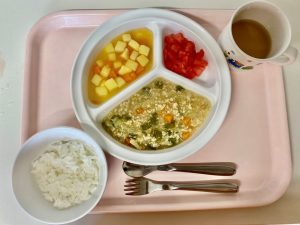 (写真は普通食です。年齢によって盛り付け量を変えて、提供しています。)