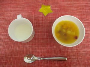※オレンジジュース(サンライズキッズ保育園のイメージカラーのオレンジ色)の中に、ぶどうゼリー、みかん缶、黄桃缶、パイン缶が入った暑い時期でもさっぱり食べやすいサンライズポンチが出来上がりました♪
