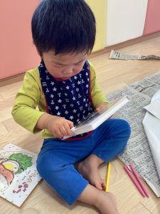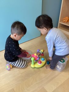 1歳児さんが2歳児さんの遊びをじっと見ています。友だち同士の交わりも見られるようになってきました!