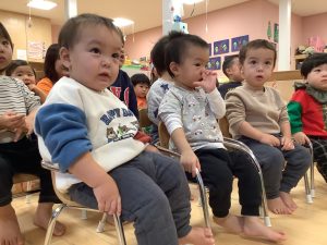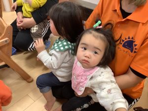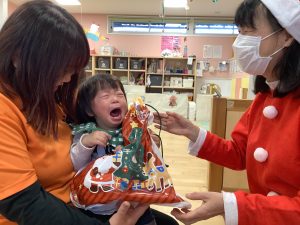 0歳児のお友だちは初めてのサンタさんに驚くばかり