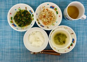 「お野菜も全部食べたよ~!!」と元気良く教えてくれました!「たくさん食べたから元気モリモリだね!!」と言うと、とても嬉しそうに笑顔を見せてくれました(^^)本当に皆かわいい♪卒園までの給食の時間も大切にしていきたいと思います。