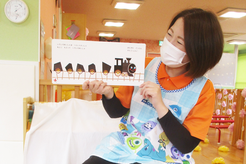 サンライズキッズ保育園湖南石部園では、子どもたちが関心を持っているものや好きなものが描かれた絵本などを選んで、毎日読み合いをしています。子どもたちは絵本や紙芝居が大好きです。