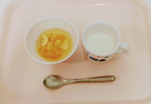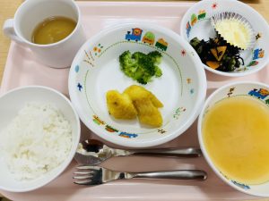 ※1歳児クラスの子どもたちは、手づかみ食べで一生懸命食べています。口の中にたくさん入れず、よく噛んで食べるようにしましょう♪