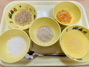 粥 味噌汁 そぼろ煮 じゃが芋と野菜のくず煮 キャベツのおかか煮