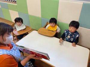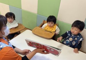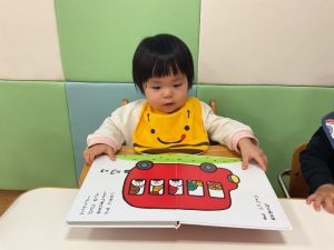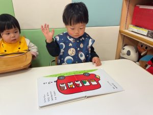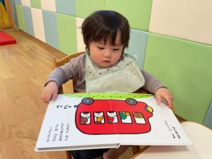 今週の絵本ブログはももぐみさんが「おべんとうバスのかくれんぼ」の絵本を見ている様子をお伝えします🚌