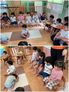 質問するお友だち🙋♀️🙋と、聞くと元気に「はーい🖐️」と、手を挙げてくれたのはりんご組さん🍎