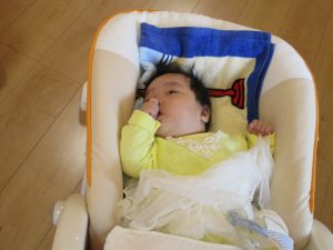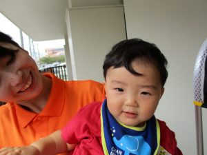隣にいる保育士の顔をじーっと見つめる0歳児さん
