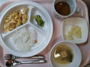 ご飯・味噌汁・炒り豆腐・梅和え・粉ふき芋