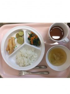 ご飯・味噌汁・魚のから揚げ・おかか和え・さつまいも甘煮