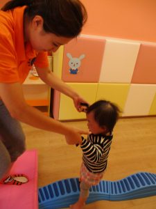 1歳児のお友だちは、先生と手をつないで渡りました。