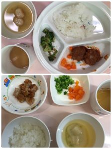 ご飯・味噌汁・おかか和え・ハンバーグ煮込み・人参甘煮