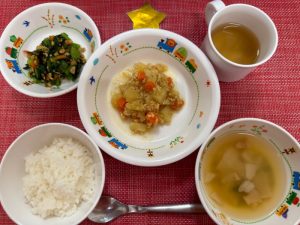 サンライズキッズ保育園 ◎給食の様子 今日は、みんなが大好きなキーマカレーでした♪「カレー楽しみだね...