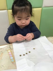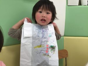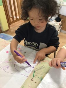 凧づくりでは、ビニールにシールを貼ったり、ペンでお絵描きをしたり✏