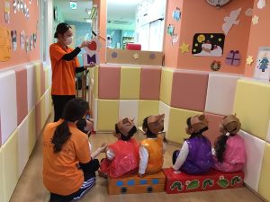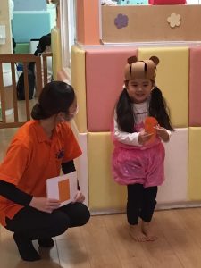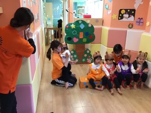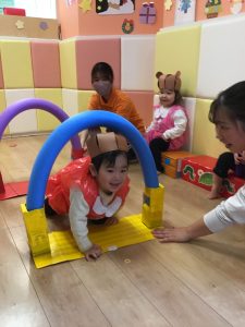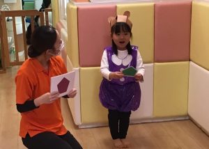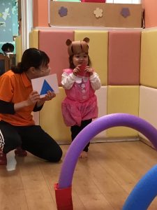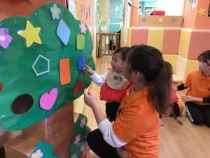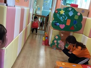 英語では、形のフラッシュカードを見た後、 保育者に言われた形と同じものを探しに出発!✊