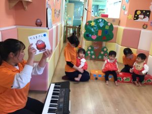 ちょっぴり緊張気味だった0歳児さんですが、絵本をじーっと見つめてしっかりお話聞くことができました💓