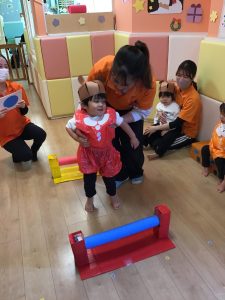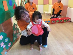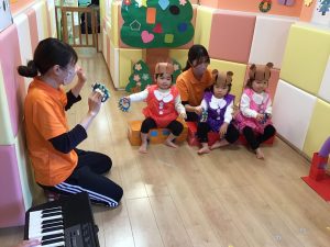 リトミックでは、1歳児さんよりもステップアップし、 いろいろな長さの音符に耳を傾けながら参加!