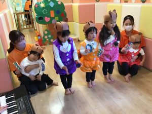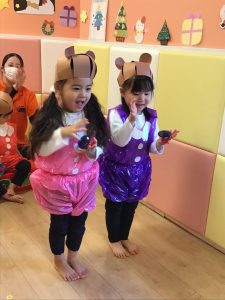 「山の音楽家」では、鈴やカスタネットを手に持ち、 音楽に合わせてリズム遊びを楽しむ姿が見られましたよ🐻‍🎶
