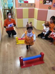 ハードルをジャンプして、木に貼ってある形を取りにレッツゴー!✊