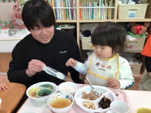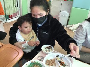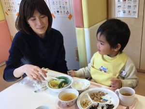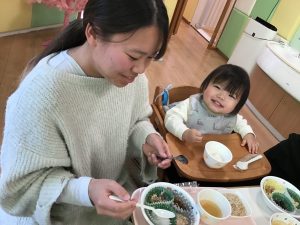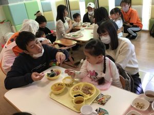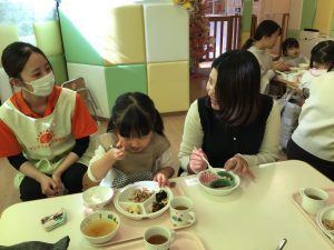 実際に子どもたちが園で食べている給食を保護者の方にも味わっていただき、「おいしいね」「こんな風にたべているんですね」と和やかな会話も聞かれました☺