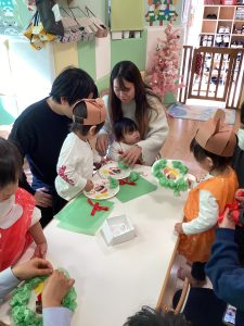 製作では、保護者の方と一緒にリース作りをしましたよ🎄