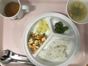 ♪♪本日のメニュー♬ ご飯・味噌汁・炒り豆腐・梅和え・粉ふき芋