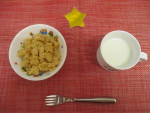 (写真は離乳食後期です。年齢によって形、固さ、盛り付け量を変えて、提供しています。)