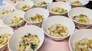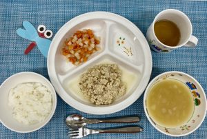 (写真は離乳食後期です。年齢によって形、固さ、盛り付け量を変えて、提供しています。)