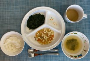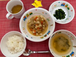 今日の給食は、豚すき煮とほうれん草のおかか和えでした。今が旬のほうれん草は葉が肉厚で甘みがあります。みんな残さず食べてくれました♪給食では、嫌いなものも出続けるので、いつの間にか食べれるようになったり、お友だちが食べているのを見て食べれるようになったりもします♪