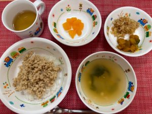 今日の給食は、鶏そぼろ丼でした!甘辛く味付けしてある鶏そぼろは、白米との相性抜群です!スプーンで上手にすくって食べていました。