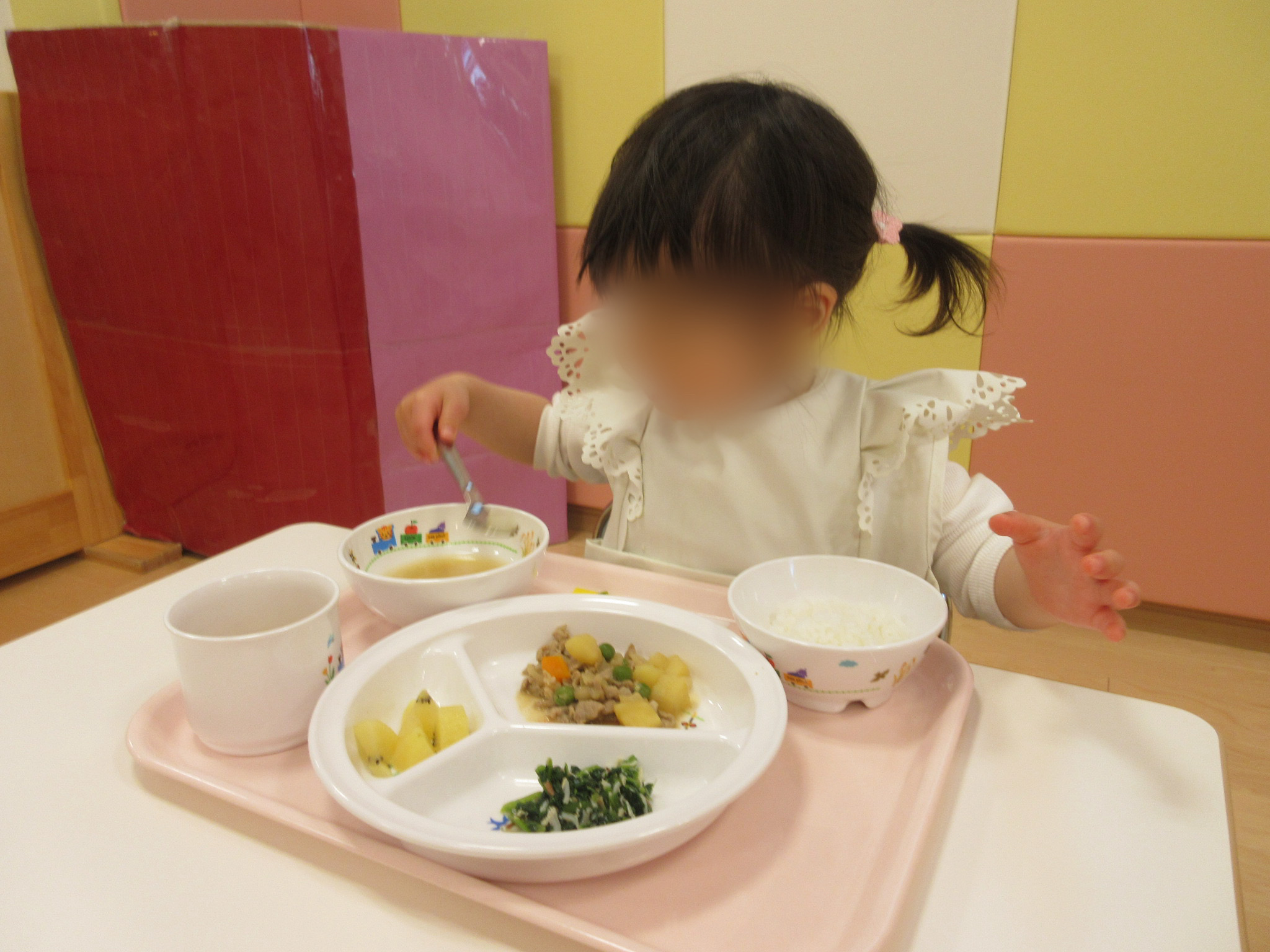 今週は給食の様子をお伝えさせていただきます。上手にスプーンを持ち、食べているいちご組さん