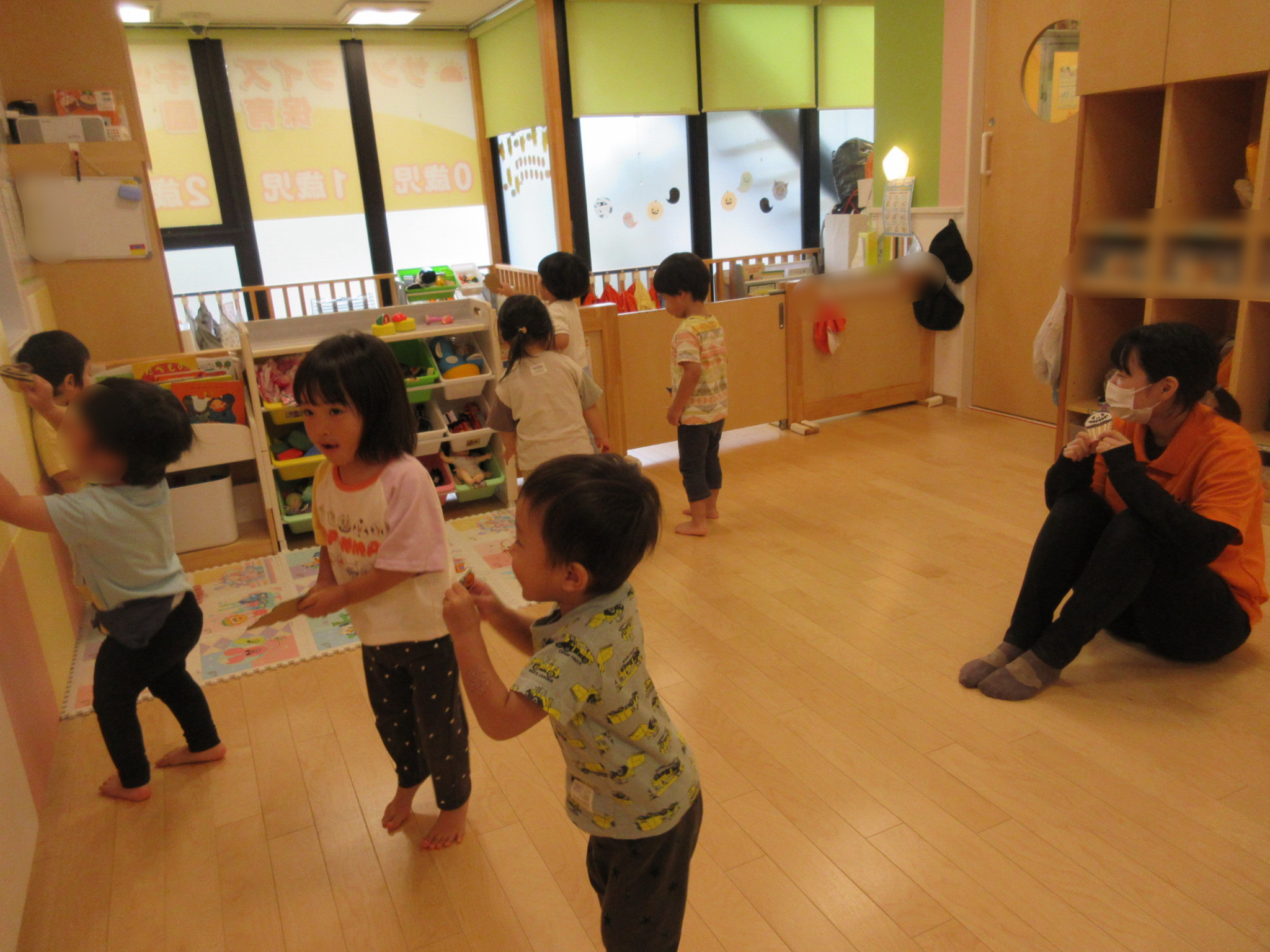 「履く」という動作はまだ1人で行うことは少し難しいですが、「脱ぐ」という動作は1人でできる子も多いため、散歩から帰ってきた後は子どもたちそれぞれ、靴下を脱いだり、靴を脱いだりと頑張って取り組んでいますよ![]()