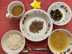 サンライズキッズ保育園 ◎給食の様子 今日の給食は、人気メニューの豚肉のしょうが焼きでした。「お肉大...